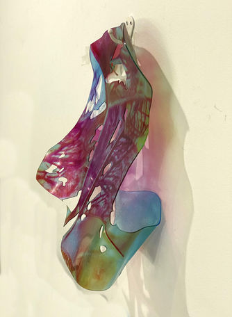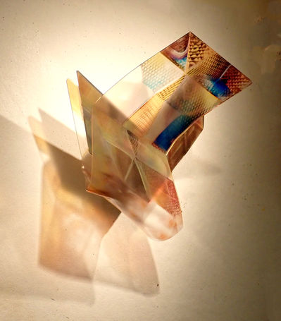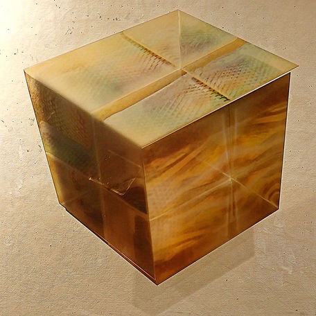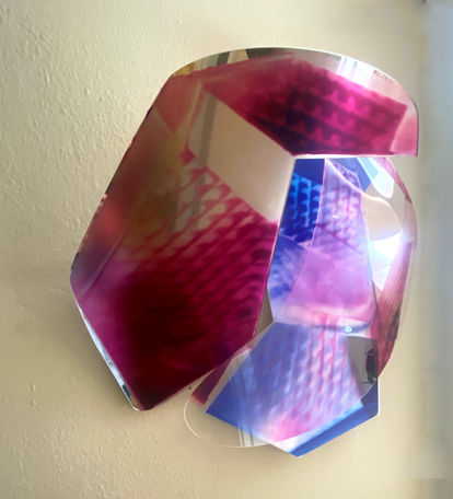 Recognizing that the physically flat Cubes and Platonic Gems have sculptural properties, I decided to enrich the viewing experience by layering and/or thermoforming the imagery. They take off from the original forms but work more as abstractions. By including internal contradictions of spatial cues, they present perceptual puzzles. Viewed from different angles the changing appearances are surprising.